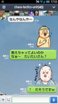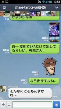(2) CTU(カオス・タクティクス・ユニット)へのご参加資格 スマフォなどでのコミュニケーションソフト「ライン」での風景です。パソコンや一般携帯でも起動ができます。 リアルタイムでカオスブレイクのみなさんとの情報の交換や世間話ができます。 ![]() 大抵はどうでもよい話が多いのですが、たまにはレアな技術情報が飛び出すこともあります。 今のところラインは参加人数が少なくて40人くらいです。 【ライン公式サイト】 ![]() 無料通話・メールアプリ LINE(ライン) (3) スカイプ版「ロマンシング・カオス」へのご参加資格 カオスブレイクの会話コミュニケーションツールの大御所のようなソフトです。 最大で15人くらい同時に会話をしたこともありますが、誰がしゃべっているのかわからないのが楽しいです。 ![]() 普通は、週末などに5〜8人くらいでしゃべっています。通話料金が無料であるのが魅力です。 スカイプのご利用には、ヘッドセット(ヘッドフォンとマイク)が必要です。 【スカイプ公式サイト】 ![]() 無料のSkypeインターネット通話と電話への格安オンライン通話 − Skype |